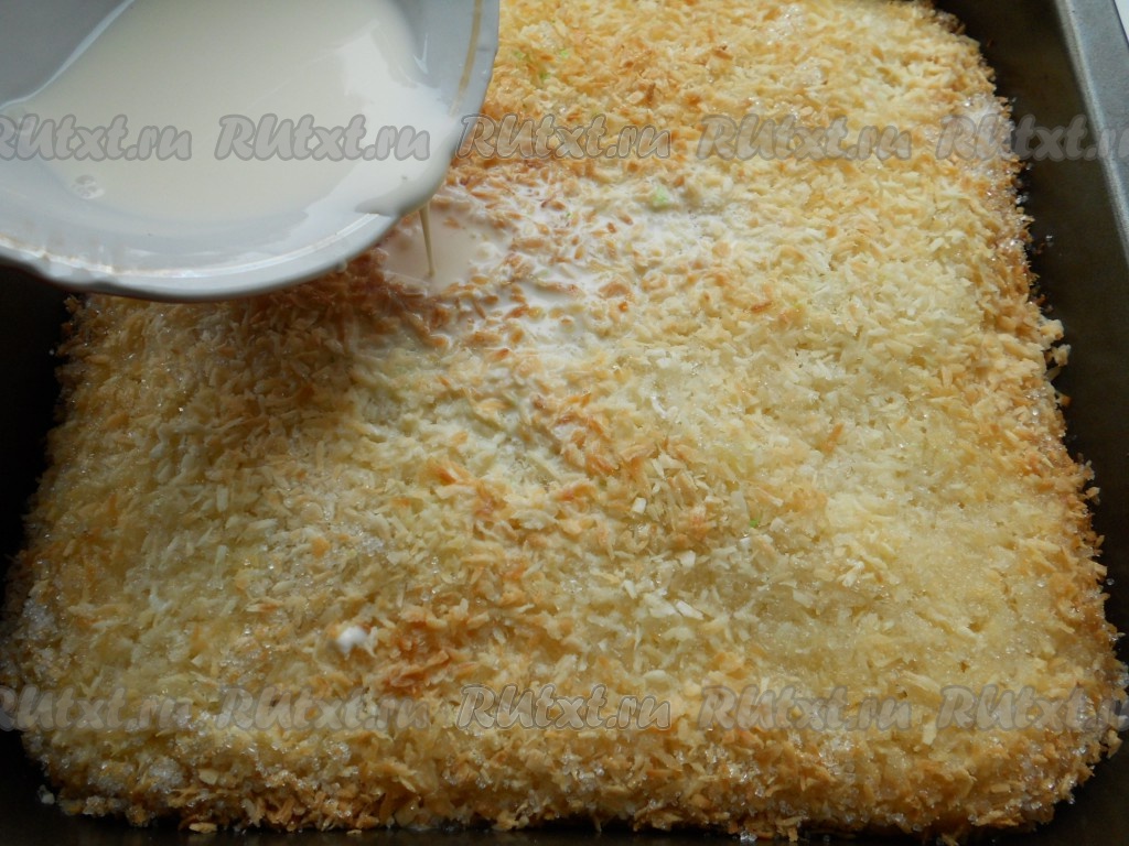 Выпекать пирог с кокосовой стружкой в предварительно разогретой до 180 градусов духовке 10-15 минут (верх зарумянится). После этого, достать форму с пирогом и накрыть фольгой. Снова поставить в духовку еще на 10-15 минут.  Готовый горячий пирог равномерно залить сверху сливками. Дать остыть в форме.