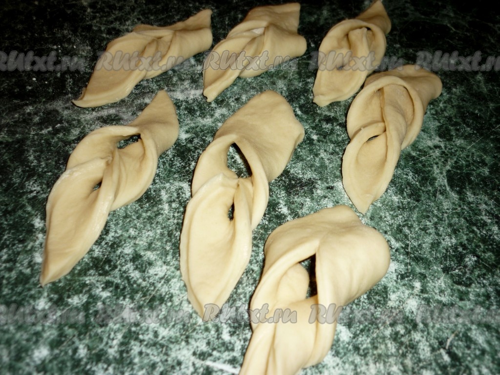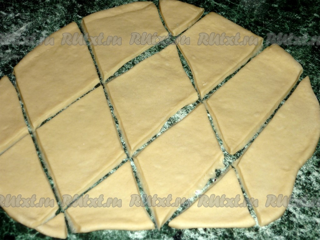 Затем на присыпанной мукой поверхности раскатать тесто в пласт толщиной 3-4 миллиметра и нарезать на ромбы.