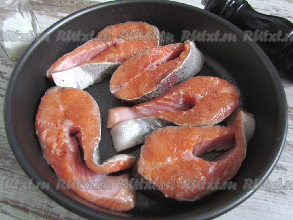 Форель промойте под холодной водой, дайте воде стечь, посолите по вкусу и добавьте щепотку белого молотого перца. Выложите рыбу в форму для запекания.