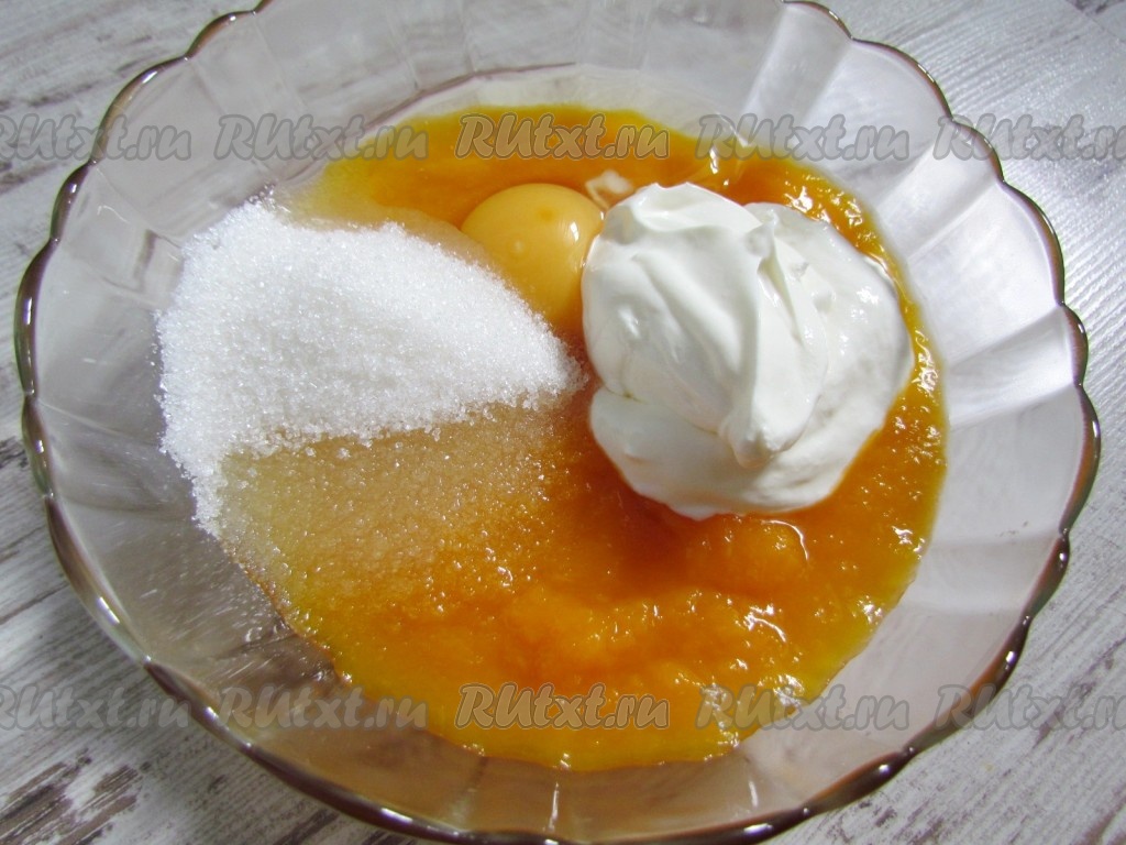 В тыквенное пюре вбейте яйцо, добавьте 2 столовые ложки сметаны, сахар (количество регулируйте по своему вкусу), ванильный сахар и соль. Хорошо перемешайте.