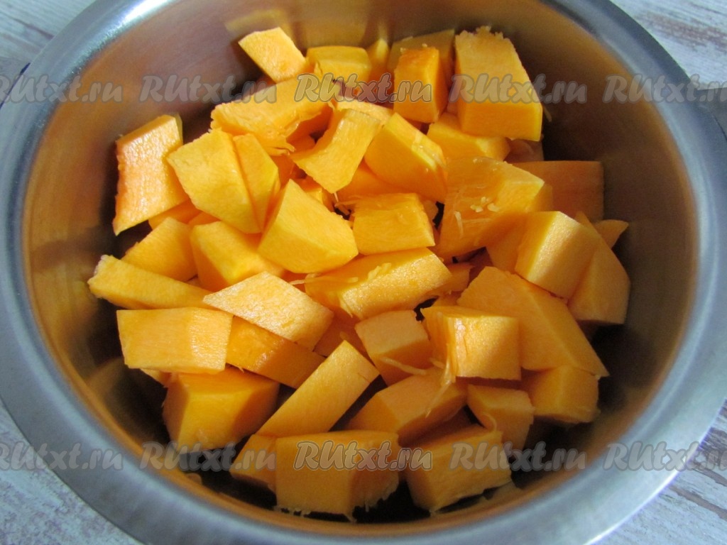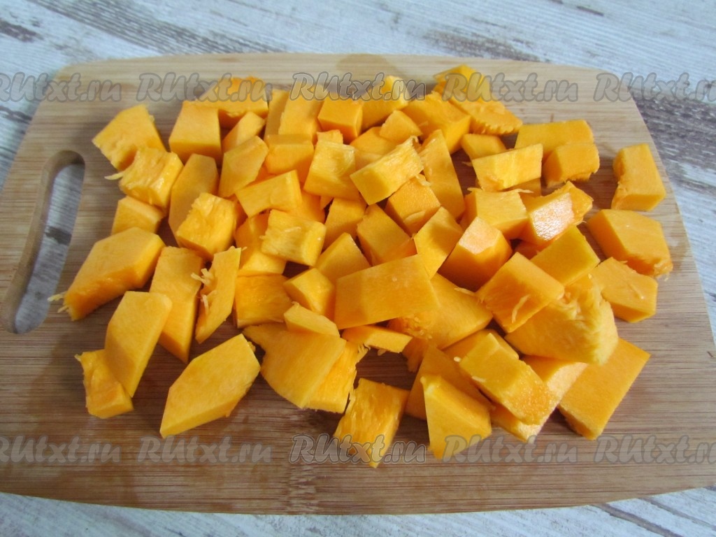 Тыкву вымойте, очистите от кожуры и семян, нарежьте кубиками.