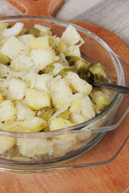 У нас называется холодный салат из картофеля. Но мы никогда не ложили маринованные огурцы, а всегда соленые. Подавали с отварным мясом, грудинкой, курицей, домашней колбасой, ветчиной. Сейчас уже и с грудкой, рыбой. У немцев есть еще горячий салат из картофеля.
