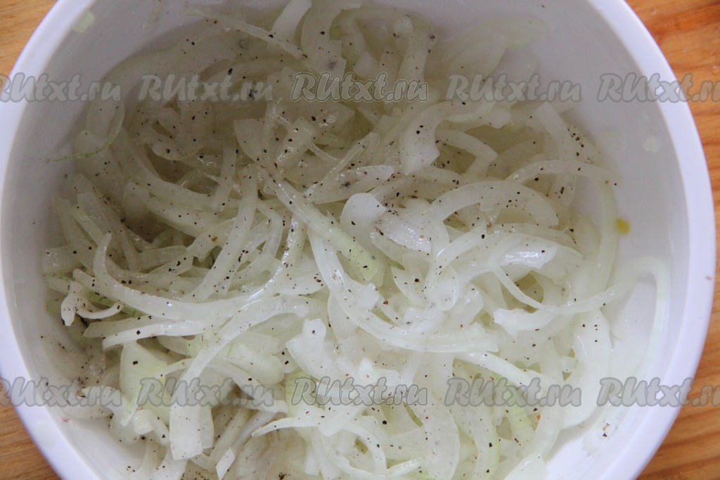 Лук очистить, нарезать полукольцами, сложить в небольшую миску, поперчить, добавить растительное масло и немного рассола от огурцов. Хорошенько помять лук руками, чтобы он пустил сок, и оставить на 30 минут.