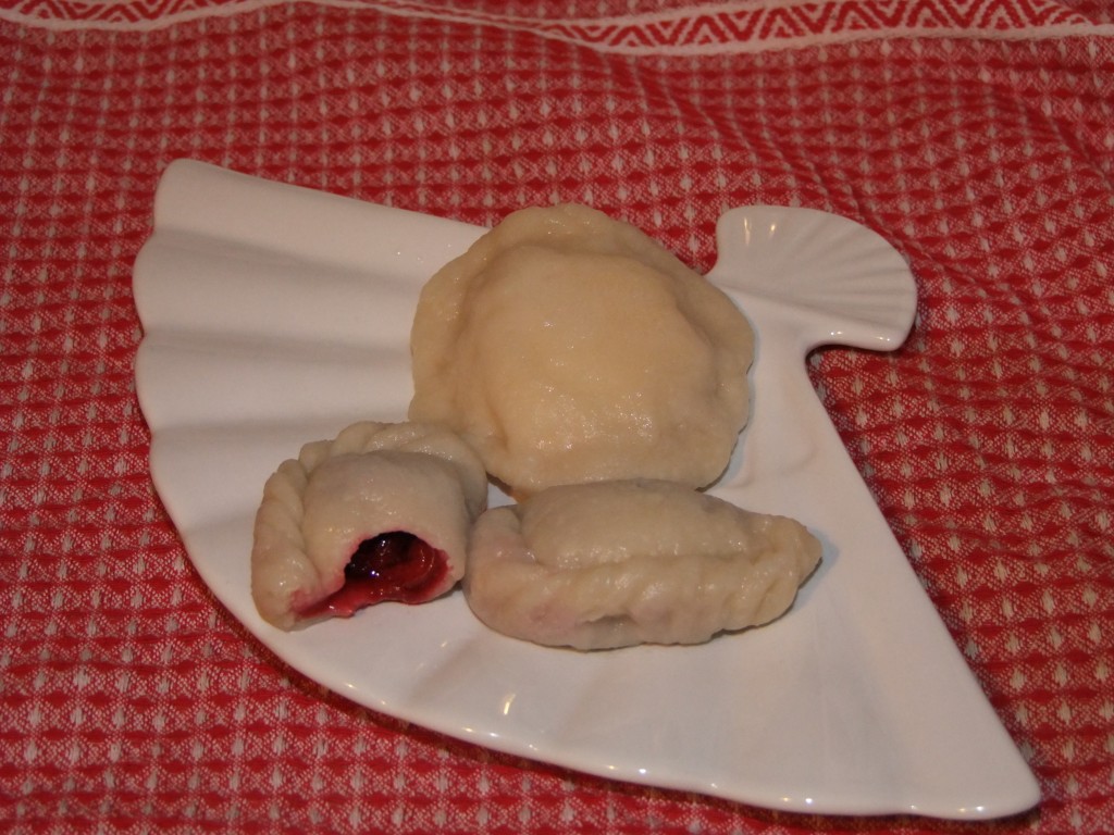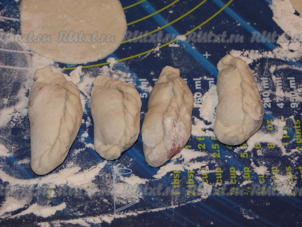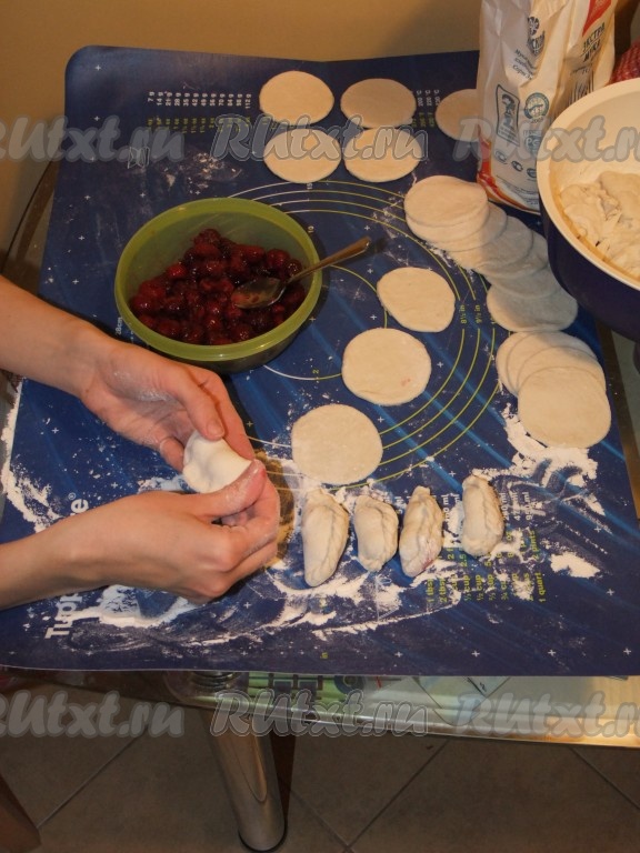 Слепили вареники с разными начинками: вишневые - с "косичкой", сырные - "полумесяцем", а творожные - "лепешкой" из двух кругляшков сразу.