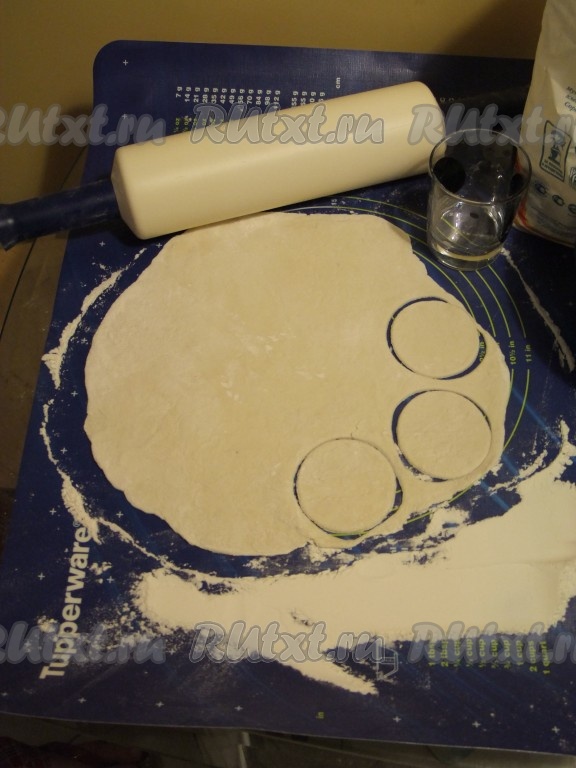 Затем раскатали тесто и вырезали стаканом кружки диаметром около 7-8 см.