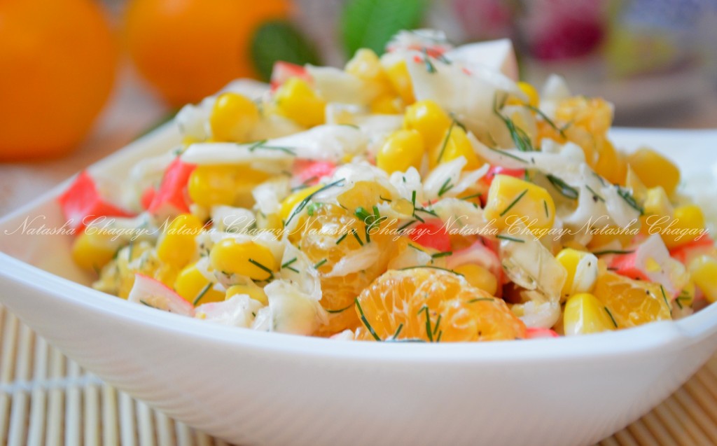 Салат, приготовленный с крабовыми палочками, апельсином, кукурузой и капустой, - вкусный, лёгкий и яркий. Необычное сочетание вкусов не может не понравиться. Если хочется повозиться и удивить гостей, очень красиво будет его сервировать в целый очищенный от мякоти апельсин. Но в целом неплохо смотрится и в салатнике.