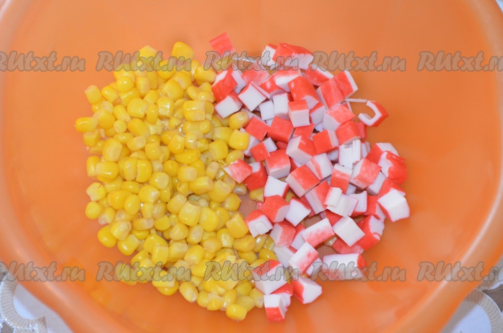 Если крабовые палочки заморожены, их нужно разморозить, затем вынуть из упаковки. С кукурузы слить жидкость. Крабовые палочки нарезать на небольшие кубики и вместе с кукурузой выложить в достаточно глубокую миску.