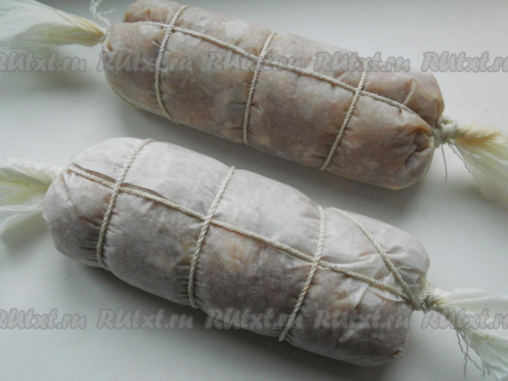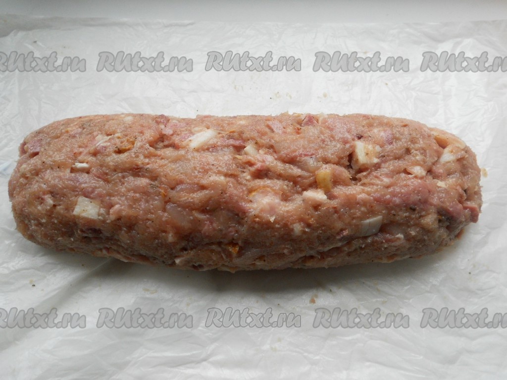 Тщательно вымешать фарш. Бумагу для выпечки (пергамент) смочить в воде и отжать. Расстелить на поверхности. Из фарша сформировать "колбаску" (у меня из данного количества фарша получилось 2 штуки) и выложить на бумагу.