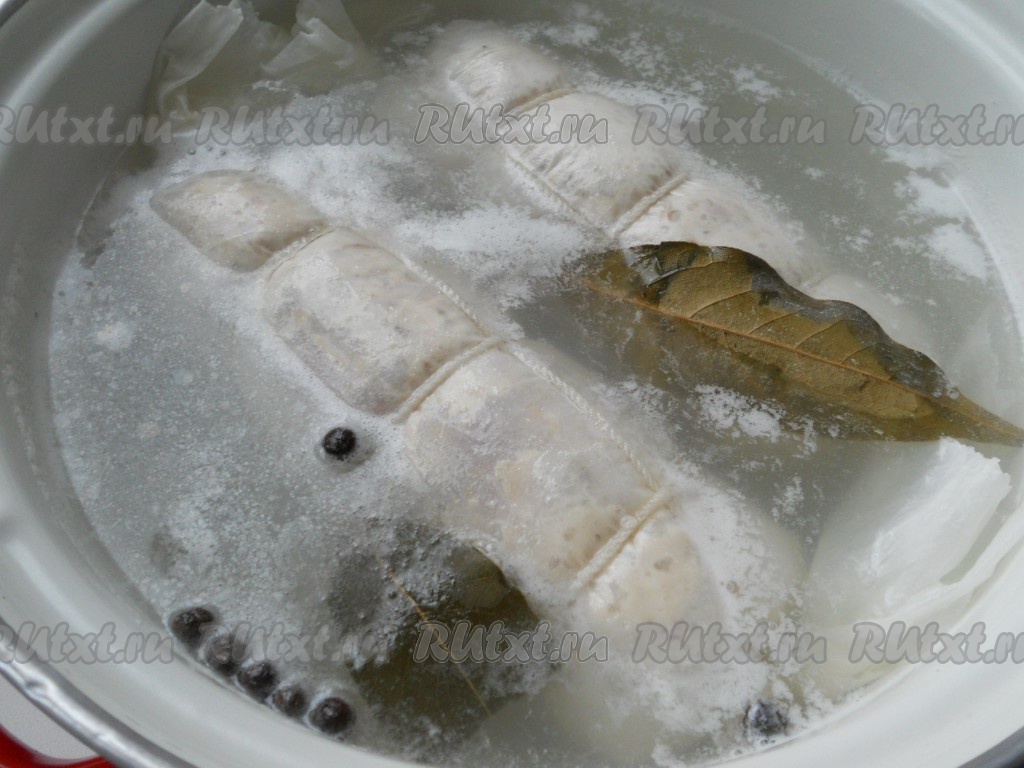 Поместить галантин в большую кастрюлю, залить водой и поставить на огонь. Довести до кипения, добавить в воду лавровый лист и душистый перец.