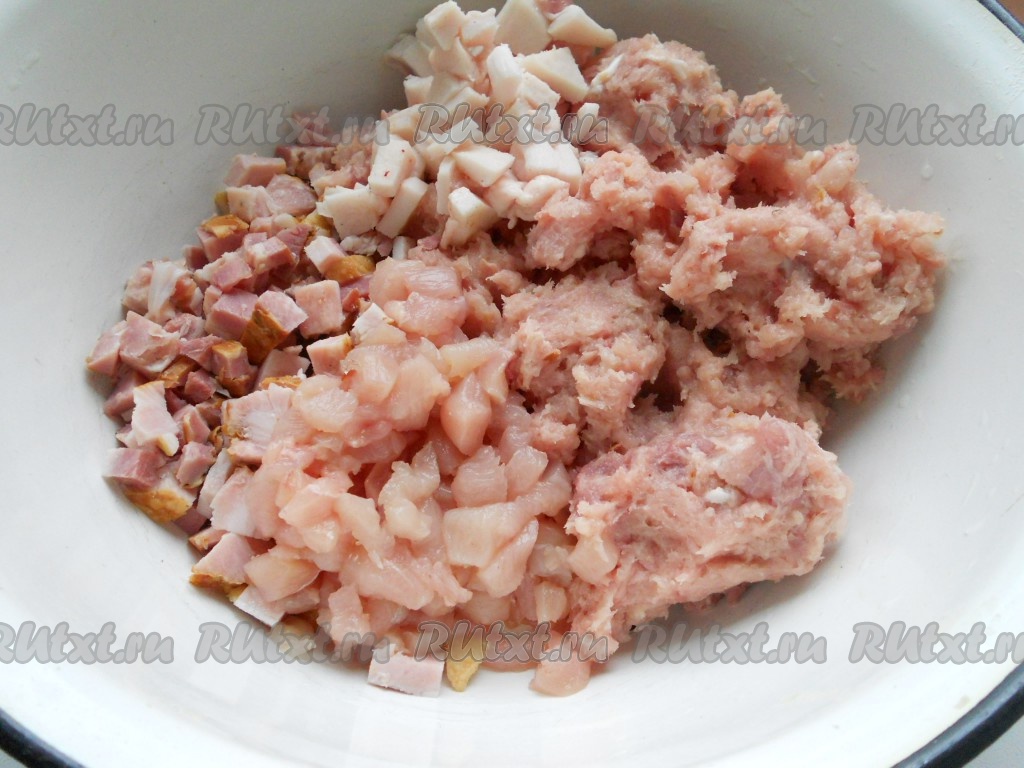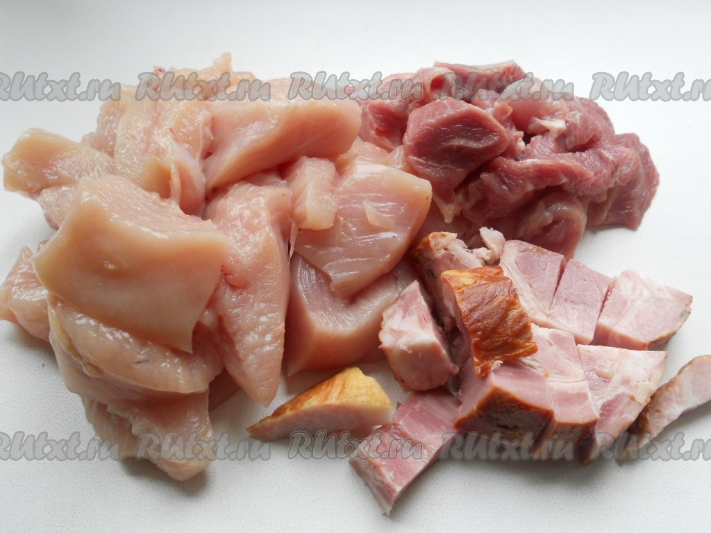 Нарезать мелкими кубиками 200 грамм куриного филе, 100 грамм свинины и копченую ветчину.