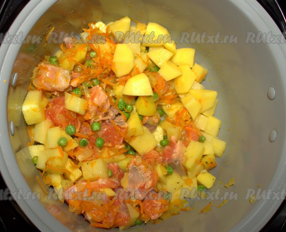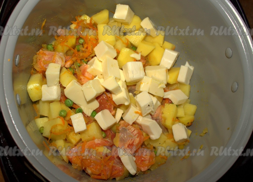 В мультиварке на режиме "жарка" (при открытой крышке) обжарить на оливковом масле сначала лук, затем добавить перец, морковь и чеснок со специями, соль. Через минут 5-10 добавить лосося, зеленый горошек, картофель