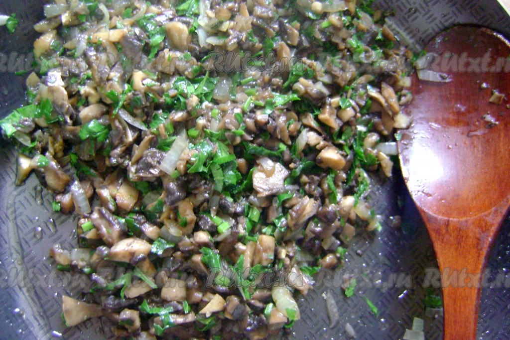Обжаренные грибы посолить, поперчить, снять с огня, дать немного остыть, а затем добавить измельчённую зелень и перемешать грибную начинку.