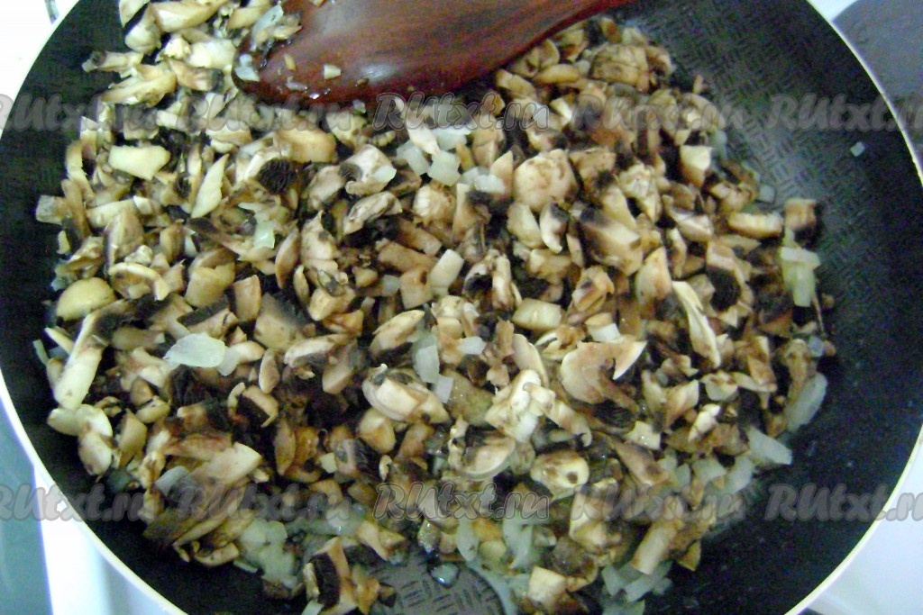 На сковороде с растительным маслом обжарить до прозрачности лук, помешивая, на среднем огне. Добавить грибы и обжаривать, иногда перемешивая, минут 8-10 (до готовности).
