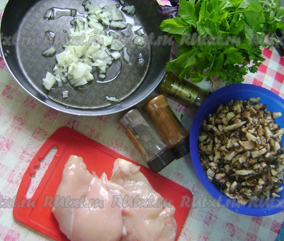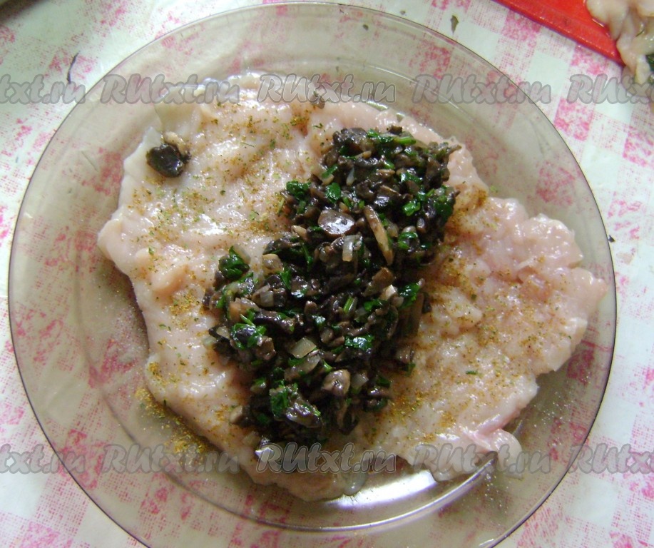 Каждое куриное филе разрезать, как книжку, и отбить кулинарным молоточком, посолить по вкусу. Приправить отбитое мясо специями (я приправила чёрным и красным молотыми перцами и приправой для курицы). Выложить на середину филе половину грибной начинки.