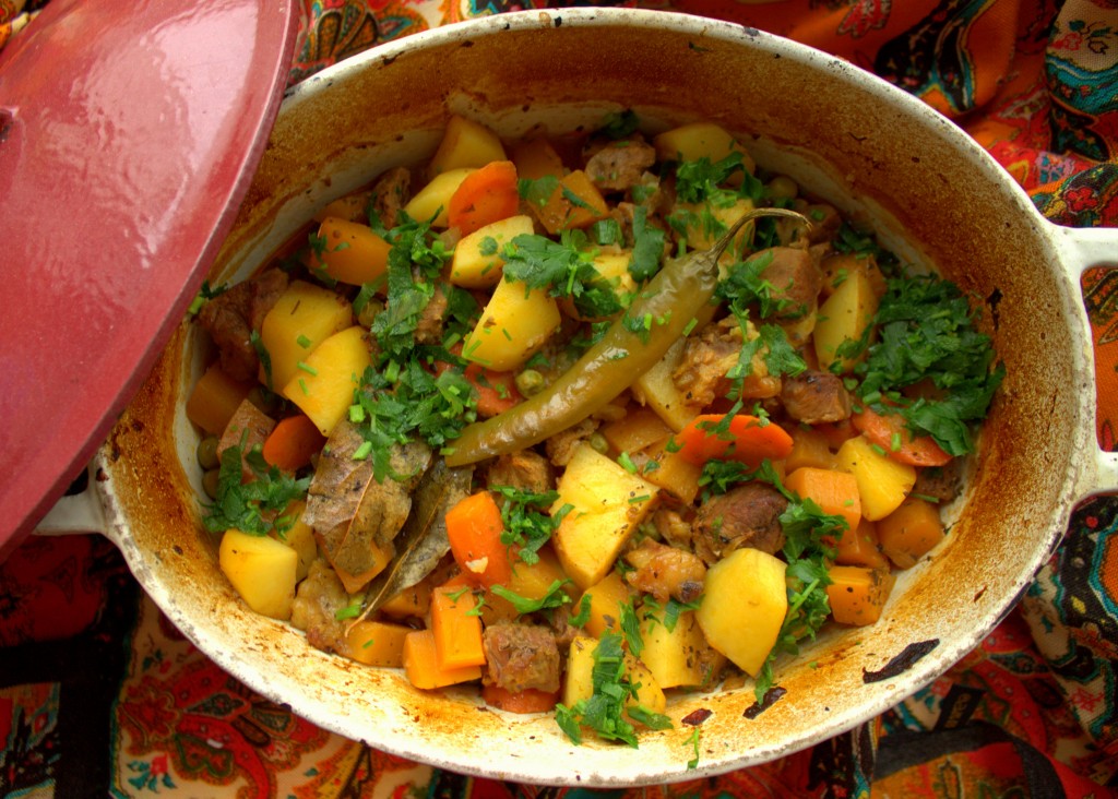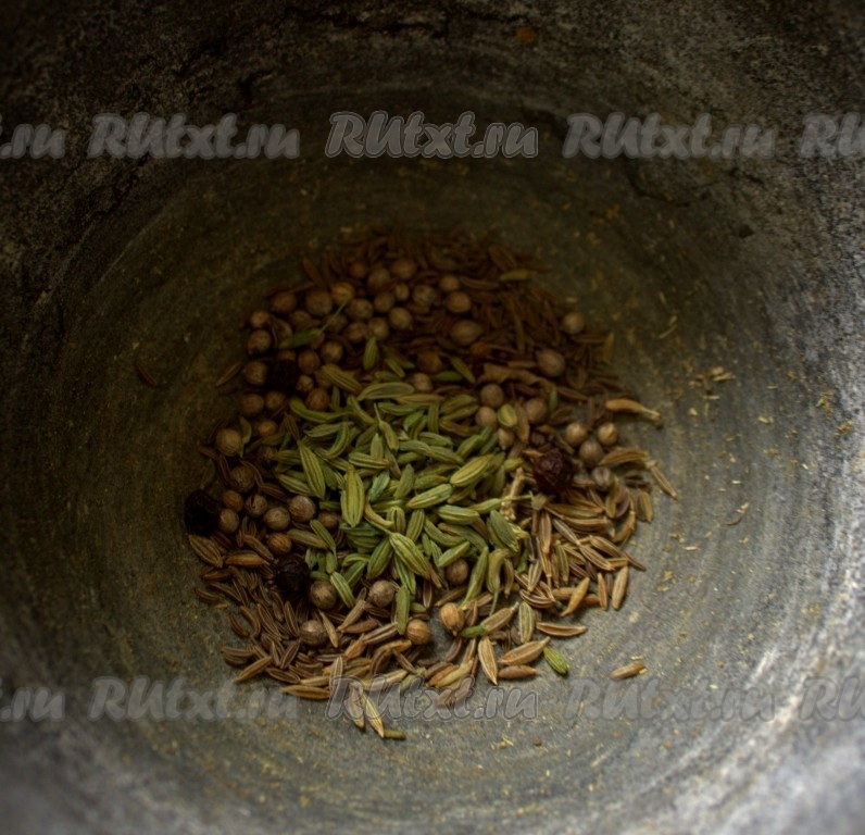 Лук нарезала мелко. Чеснок просто раздавила ножом. Говядину нарезала небольшим кубиком. Картофель и тыкву нарезала кубиком примерно одинакового размера. Горошек промыла. Морковь нарезала наискосок. Специи измельчила в ступке. В качестве специй я взяла кориандр, фенхель, зиру, тмин и перец чёрный.