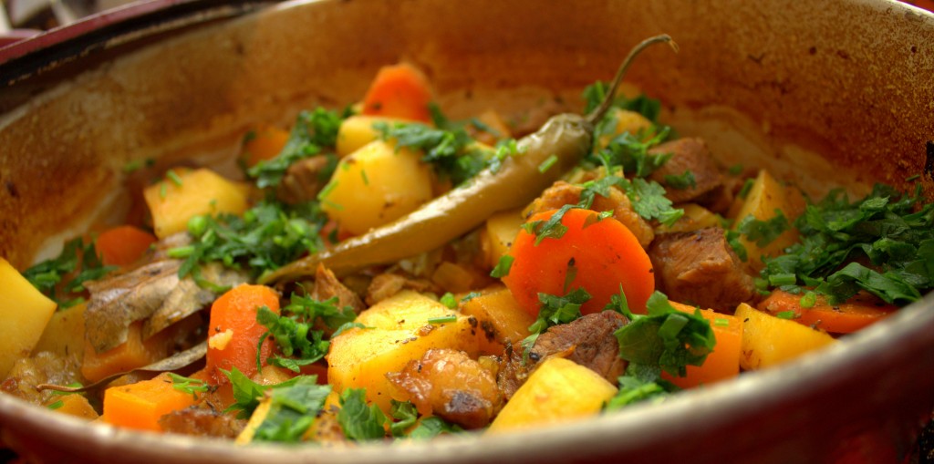 Сначала у меня горшочек с говядиной и овощами запекался при температуре 220-250 градусов примерно 30 минут, а затем еще час - при температуре 180-200 градусов. Готовность определяйте по картошке и по мясу.