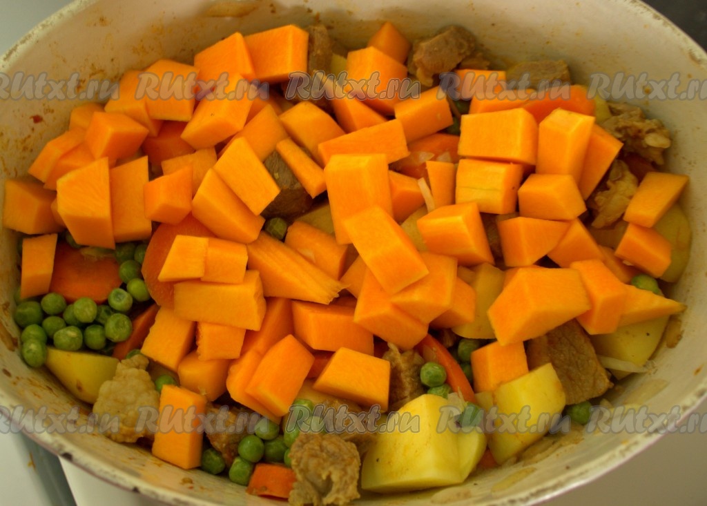 Через минут 5-7 добавила зеленый горошек и тыкву.