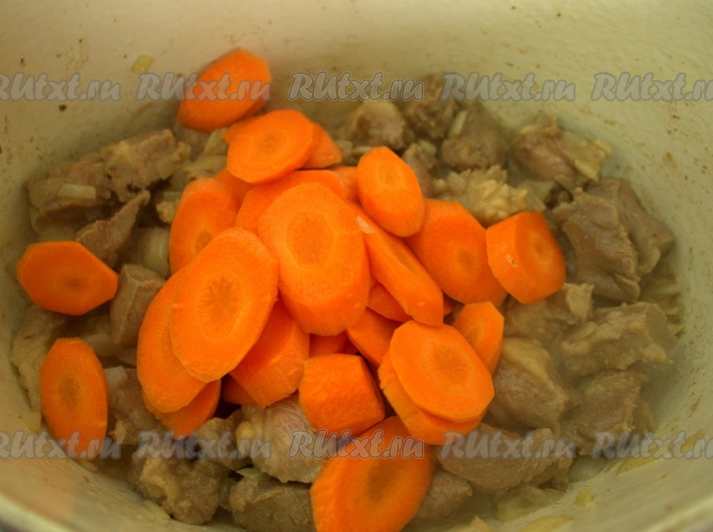 В кастрюле с толстым дном (в казане или утятнице) чуть обжарила лук, точнее я его чуть припустила на масле с водой, так как не хотела жарить. Если вы хотите, конечно, жарьте и мясо до золотистого цвета, но мне нужно было нежареное, потому я добавила буквально 0,5 стакана, а может и меньше водички. Добавила горядину, оставила готовиться на минут 15, периодически помешивала.