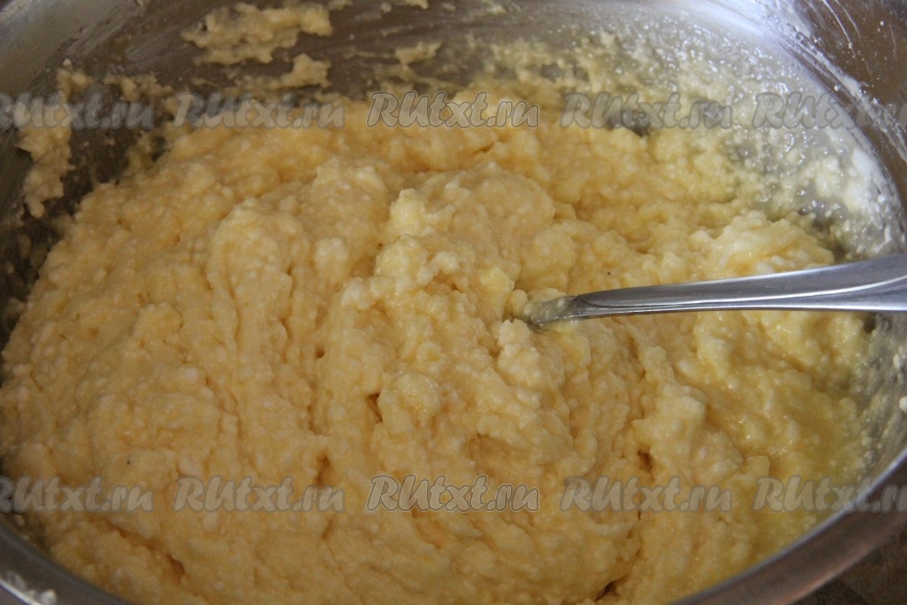 В перекрученный творог добавляем яйца и соду. Хорошенько перемешиваем всю творожную массу.