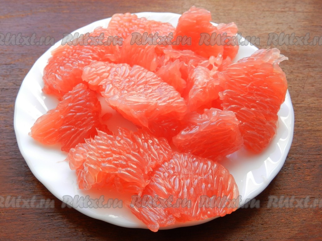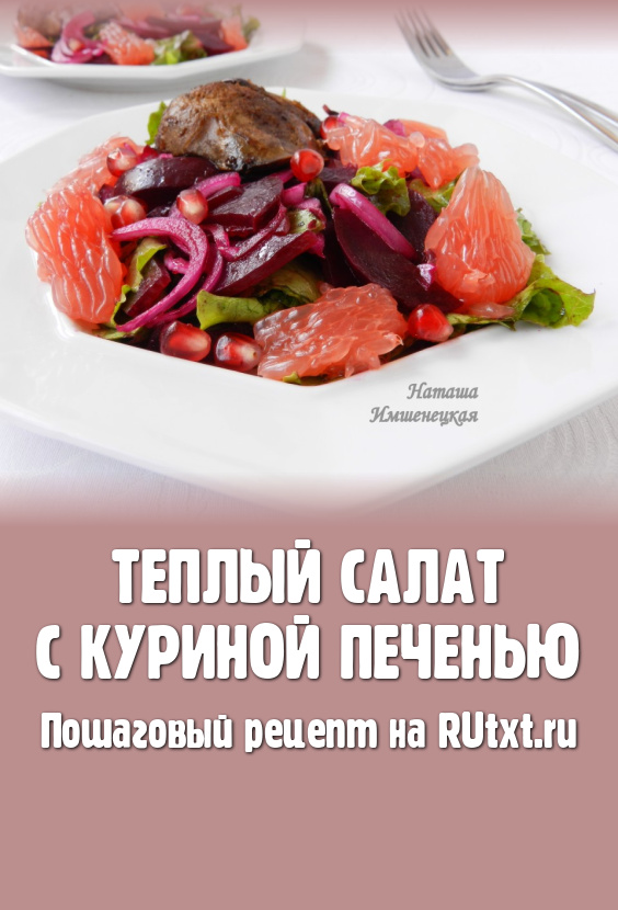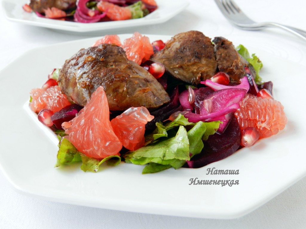 По тарелкам разложить салат, добавить обжаренную печень, кусочки грейпфрута, присыпать зернами граната. Вкусный и оригинальный теплый салат с куриной печенью готов.