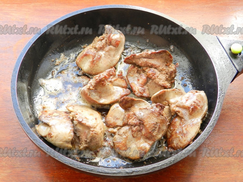 В сковороде разогреть растительное масло и обжарить куриную печень со всех сторон по 2-3 минуты. В процессе обжаривания печень посолить. Сок, вытекающий из готовой печени, должен быть прозрачным.