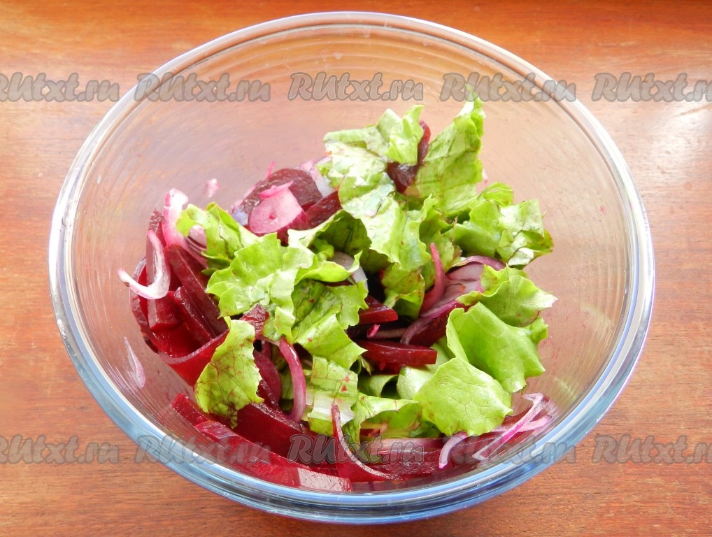 Добавить свеклу, посолить по вкусу, заправить оливковым маслом и соком грейпфрута, аккуратно перемешать.