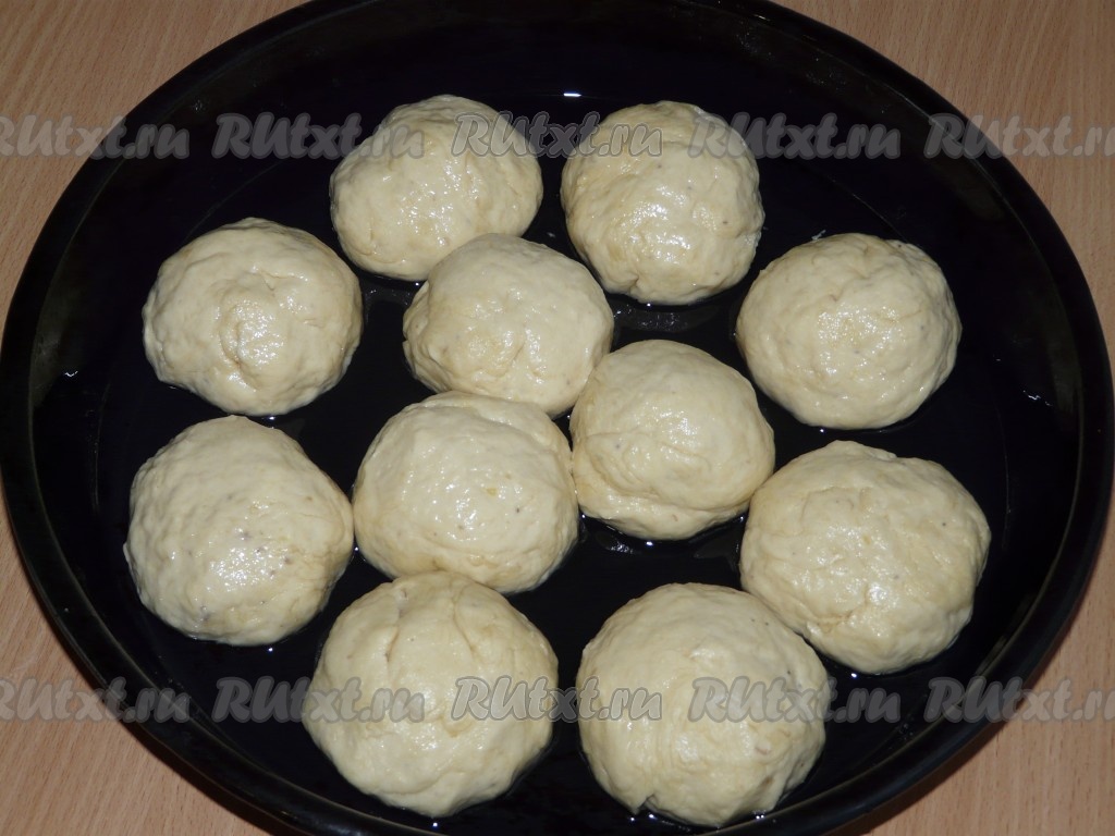 Тесто разделить на порции, сформировать булочки и выложить их на противень (противень смазать растительным маслом). Поставить противень в тёплое место, чтобы банановые булочки поднялись.