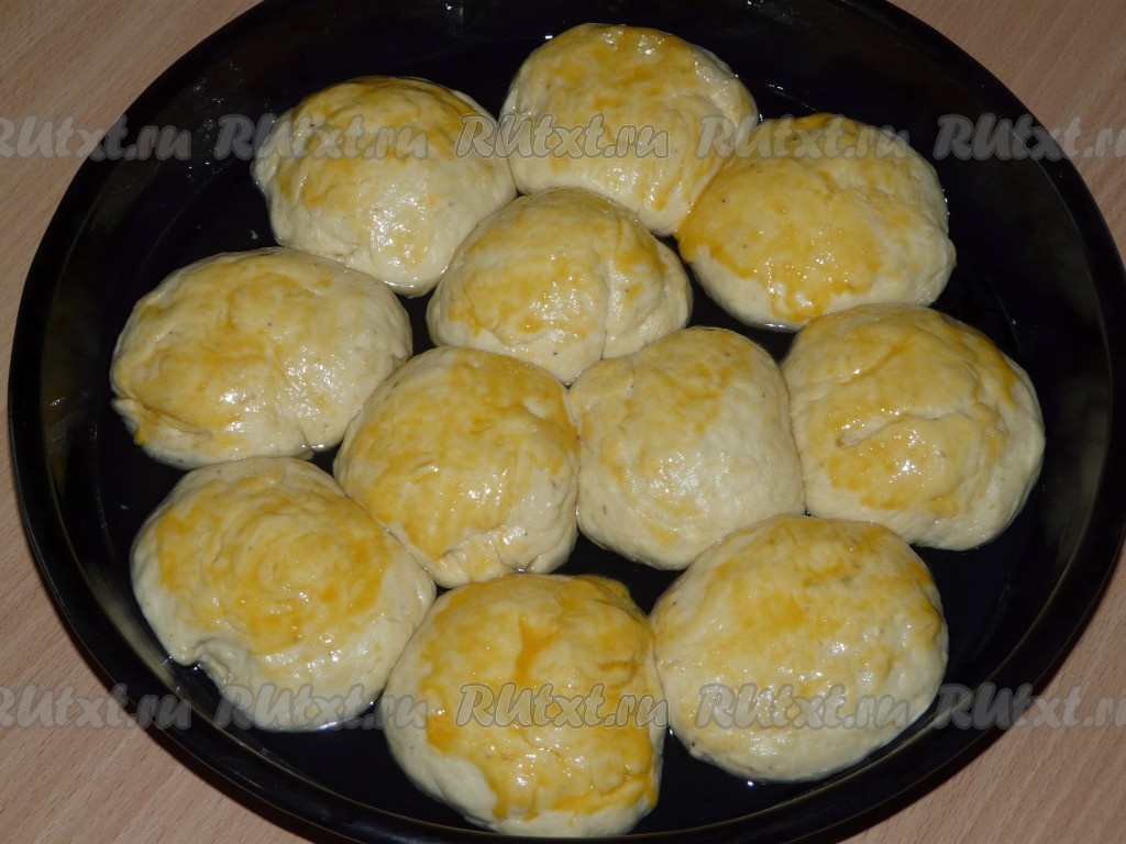 Подошедшие булочки смазать взбитым яичным желтком. Поставить булочки в заранее разогретую духовку и выпекать при 200 градусах примерно 25-30 минут.
