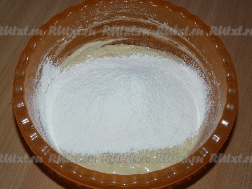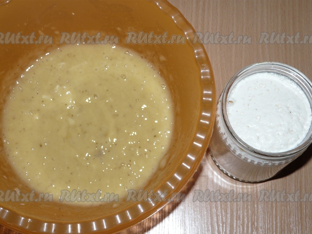 В банановое пюре вылить опару, добавить растопленное масло и оставшуюся муку.