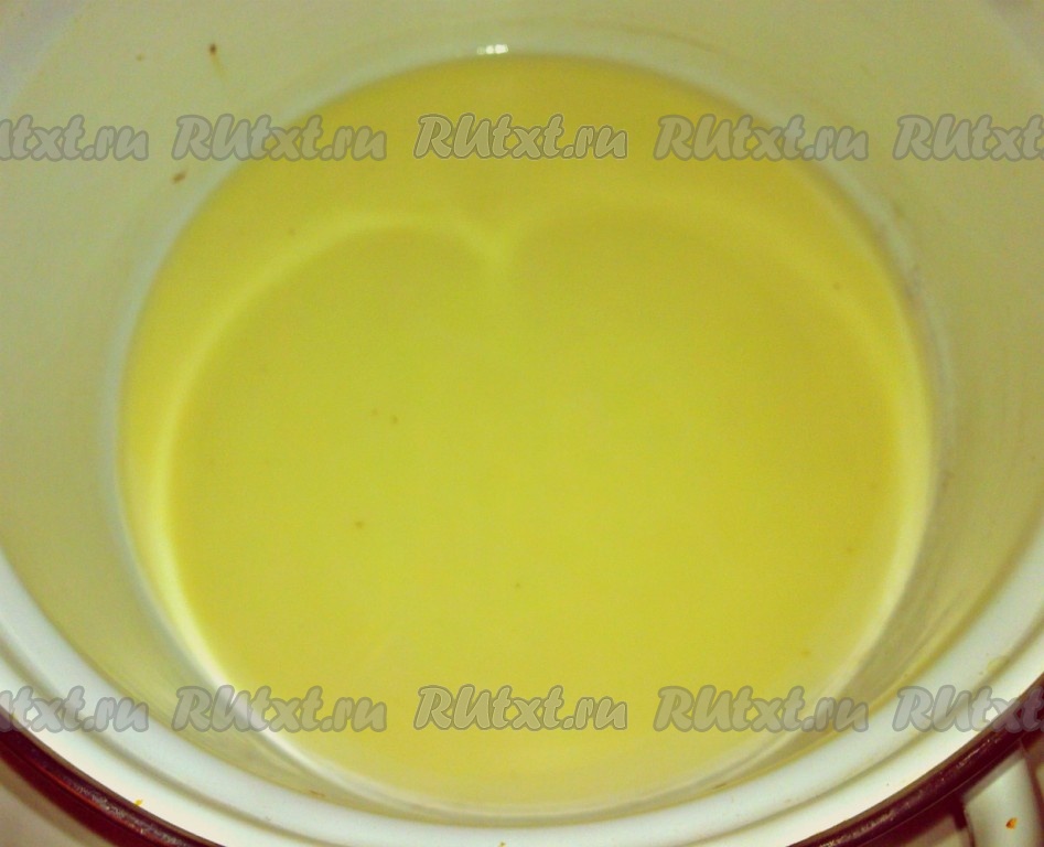 В получившееся тесто тонкой струйкой, постоянно перемешивая венчиком, вливаем 250 миллилитров воды, предварительно доведённой до кипения. Добавляя воду, учитывайте, что блинное тесто должно получиться однородным, в меру жидким, можно сказать, льющимся, но и жидким, как вода, оно быть не должно. Затем вливаем растительное масло и ещё раз перемешиваем. Оставляем тесто на 10 минут "отдохнуть".