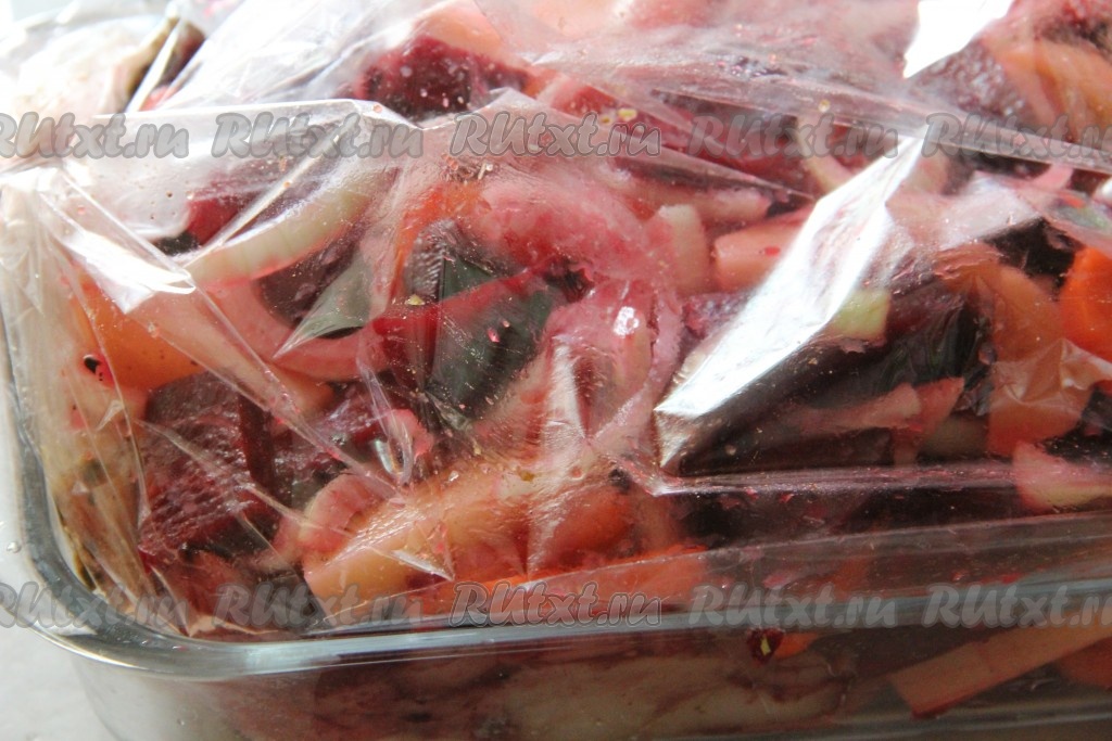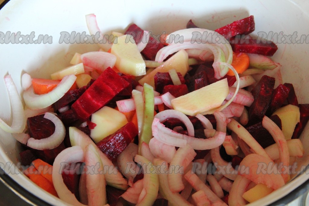 Свеклу, морковь, картофель и лук очистить, нарезать соломкой или любой другой формы. Посолить овощи и поперчить.