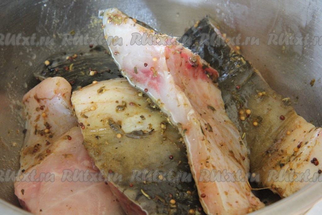 Рыбу натереть специями, солью и перцем. Разрезать по желанию на порционные кусочки. Оставить на некоторое время промариноваться.