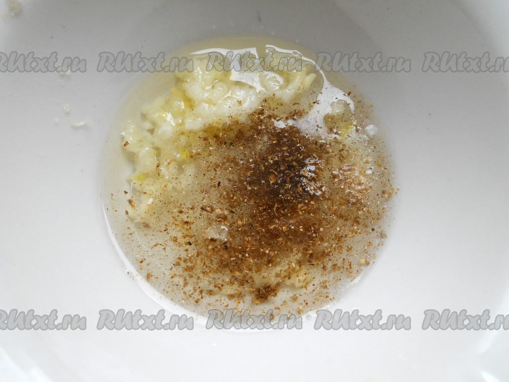 Приготовить заправку: смешать растительное масло с уксусом, солью, сахаром, добавить кориандр и пропущенный через пресс чеснок.