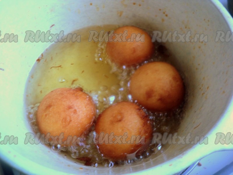 В кастрюле (или в сковороде с высоким бортиком) нагреть достаточное количество растительного масла. При помощи столовой ложки выкладывать тесто в кипящее масло в виде клецок и жарить на среднем огне до румяности со всех сторон. Чтобы пончики быстро не зажаривались сверху и успевали пропечься изнутри, огонь должен быть ниже среднего. Готовые пончики из сгущёнки вначале выкладывать на бумажные салфетки, чтобы убрать лишнее масло, а затем перекладывать на тарелку для подачи. Постепенно пожарить все пончики.