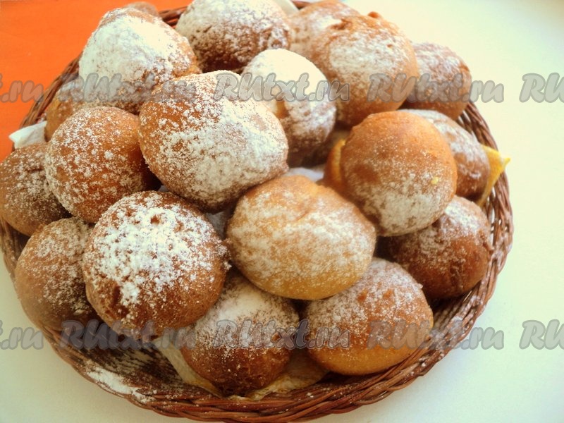 Жареные пончики из сгущёнки посыпать сахарной пудрой и можно подавать к столу.