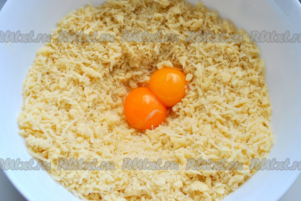 В большой миске смешать натертый на мелкой терке пармезан, масло, нарезанное кубиками, и муку. Растереть ингредиенты в крошку, добавить желтки и снова растереть.