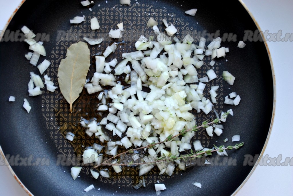 Грибы очистить и нарезать кубиками (оставить пару шампиньонов для украшения). Лук очистить и нарезать кубиками, обжарить на оливковом масле с веточками тимьяна и лавровым листом около 2 минут, добавить грибы, посолить и жарить до готовности. Вынуть лавровый лист и тимьян, грибы с луком остудить, измельчить в блендере.