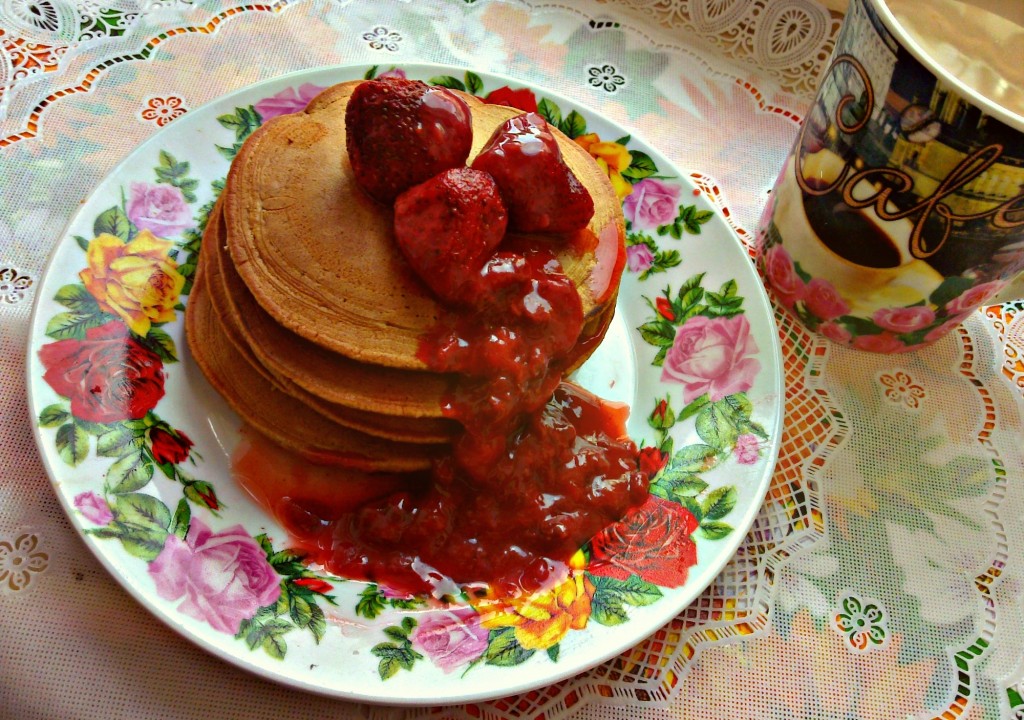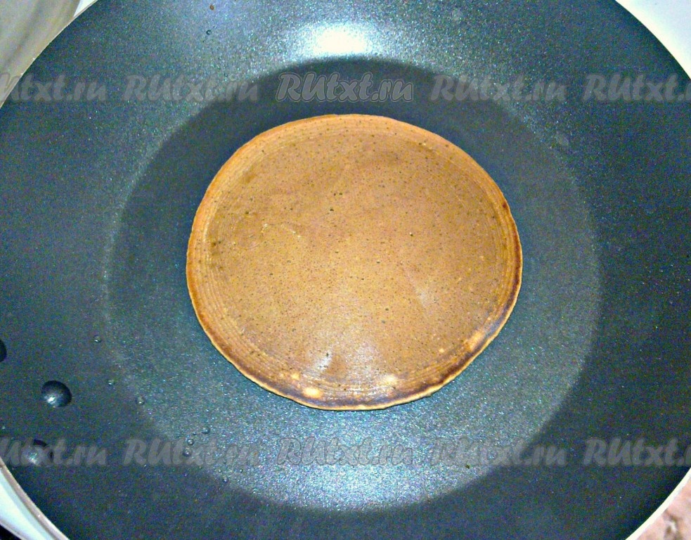 Накрыть сковороду крышкой и готовить панкейк до подрумянивания с другой стороны. Готовый панкейк переложить на тарелку. Постепенно из оставшегося теста пожарить все панкейки, складывая их аппетитной стопочкой на тарелку.