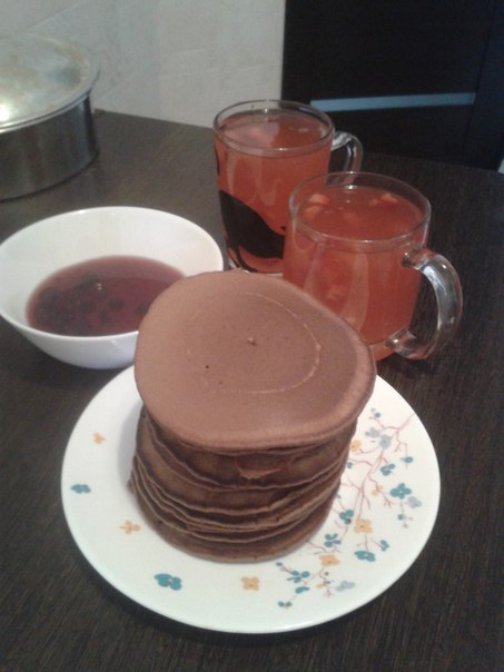Панкейки, замешанные на молоке с какао по этому рецепту, получаются наивкуснейшими, к столу подаём с вареньем, джемом или сметаной.