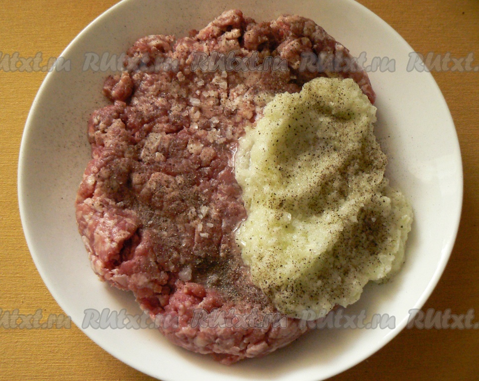 Мясо перекрутите через мясорубку, добавьте перемолотый лук, соль и перец.