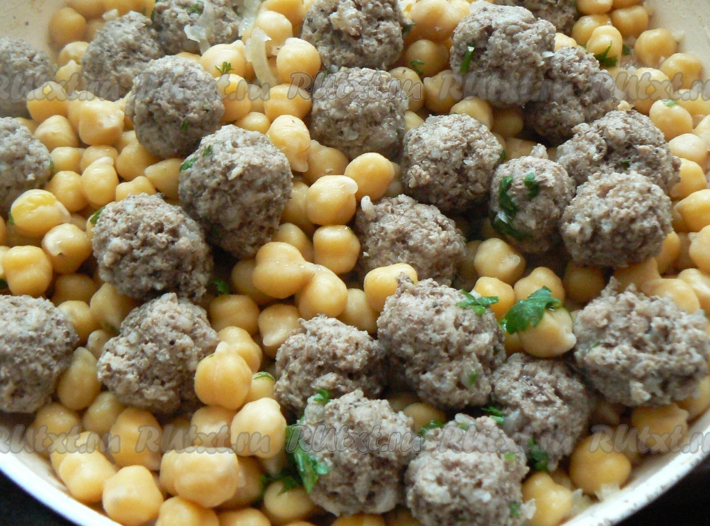 Минут через пять добавьте к нуту сваренные фрикадельки, измельченную зелень и томатную пасту. Хорошо перемешайте, дайте прогреться блюду несколько минут и сразу же подавайте к столу.