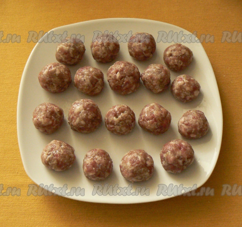 Фарш перемешайте. Смачивая руки водой, слепите фрикадельки. Отварите до готовности в соленой воде. Сохраните немного бульона, в котором варились фрикадельки.