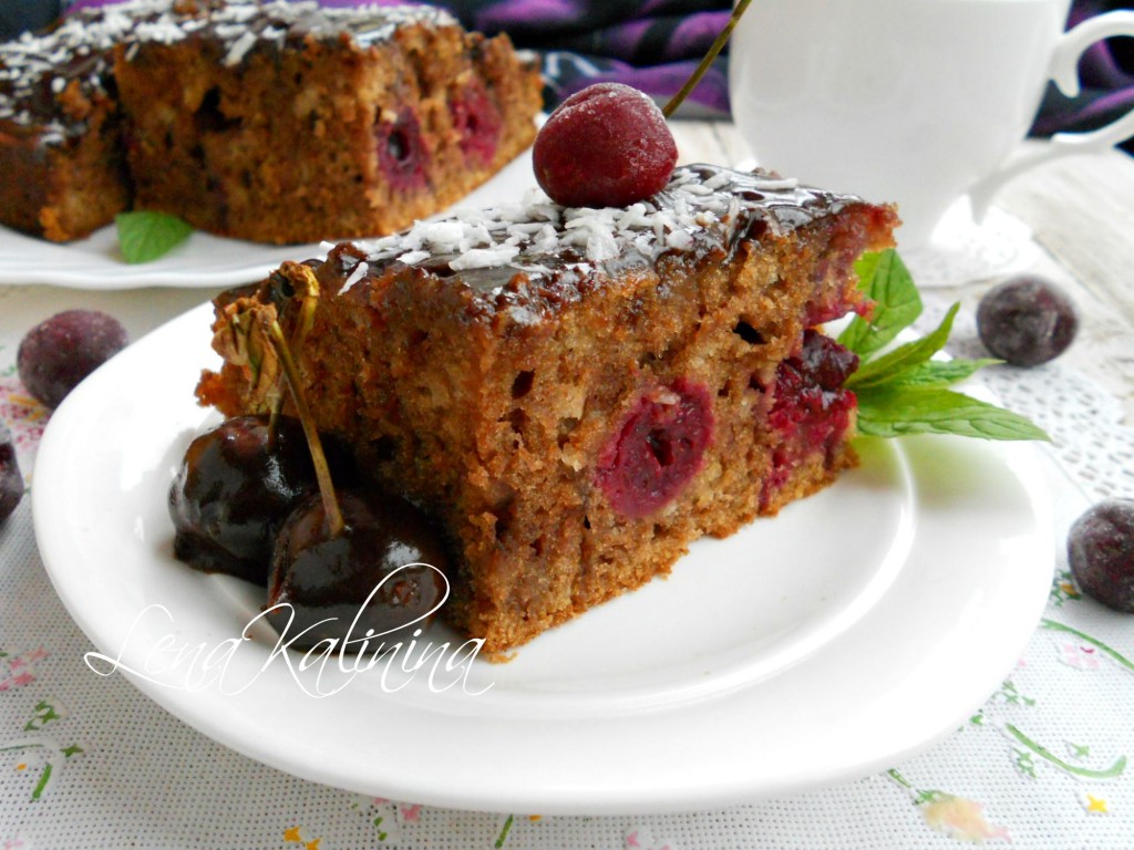Дать пирогу полностью остыть и смазать сверху шоколадной глазурью (по желанию) и посыпать кокосовой стружкой. Необычайно вкусный шоколадный пирог с вишней подать к столу! Попробуйте, обязательно!