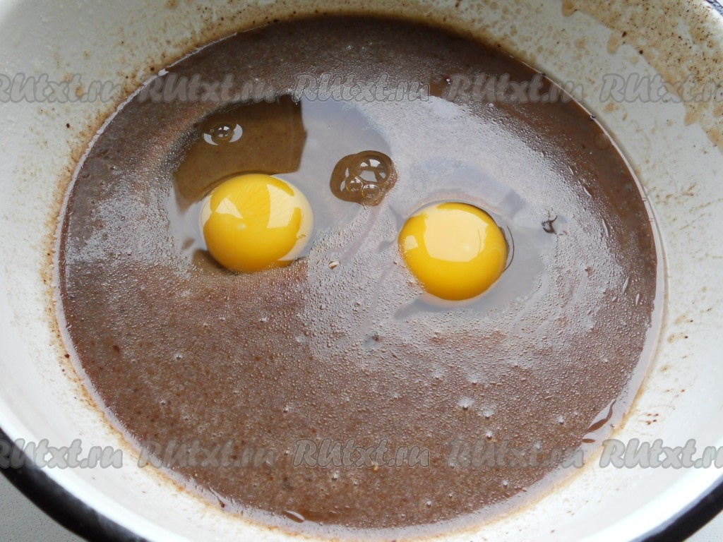 Треть этой смеси отлить в другую посуду (понадобится позже), а в оставшуюся добавить яйца и ванильный сахар. Перемешать.