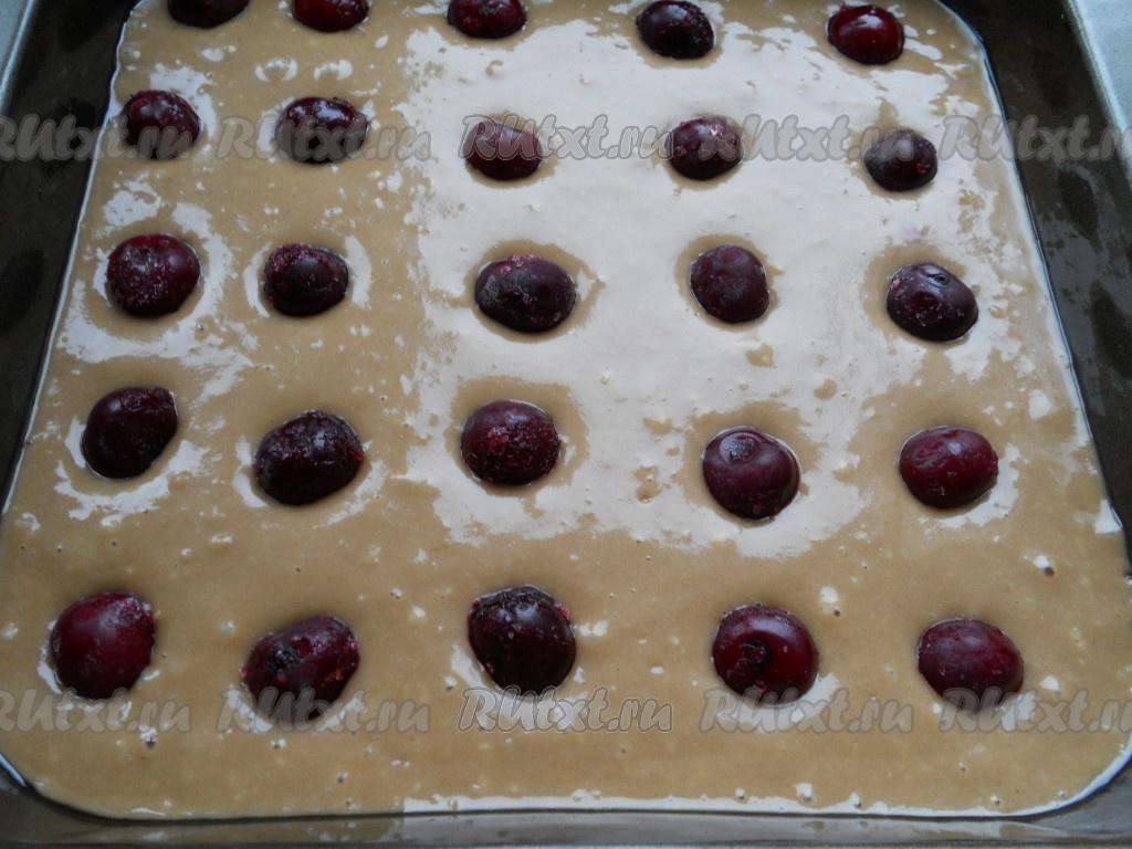 Форму немного смазать маслом и вылить в нее тесто. Сверху разложить вишни.