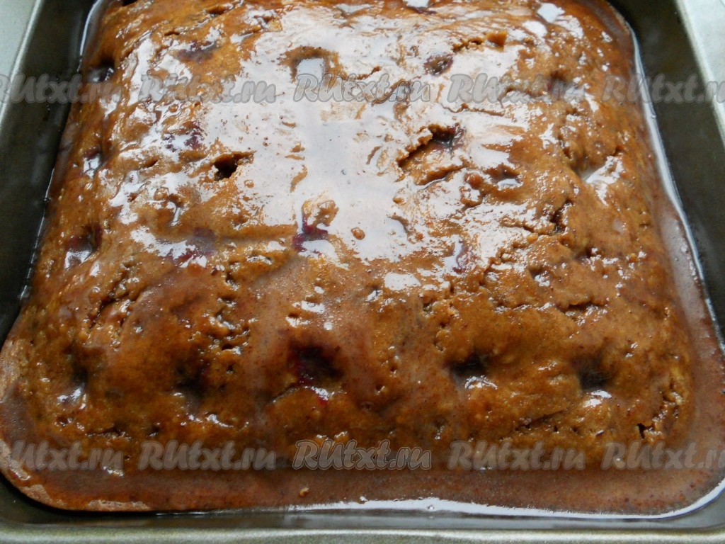 Духовку разогреть до 180 градусов. Выпекать пирог 20-30 минут (готовность проверить деревянной шпажкой). Готовый горячий пирог залить смесью, которую оставляли. Для лучшей пропитки, сверху на пироге сделать небольшие разрезы.