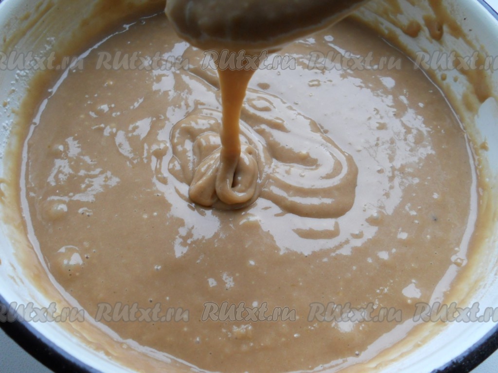 Всыпать просеянную муку и разрыхлитель. Взбить миксером. Масса должна получиться, как не очень густая сметана.