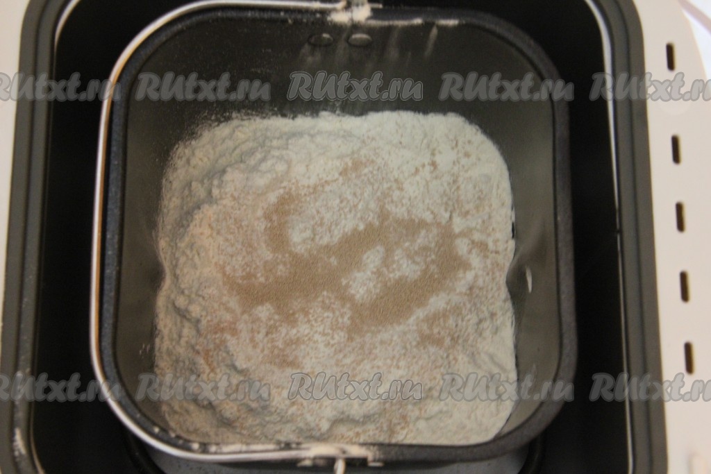 В ведёрко вашей хлебопечки влейте тёплую воду (температура воды должна быть не более 40 градусов) и растительное масло. Добавьте муку, в разные углы ведёрка положите сахар, соль, сухое молоко. Самыми последними положите в середину сухие дрожжи.