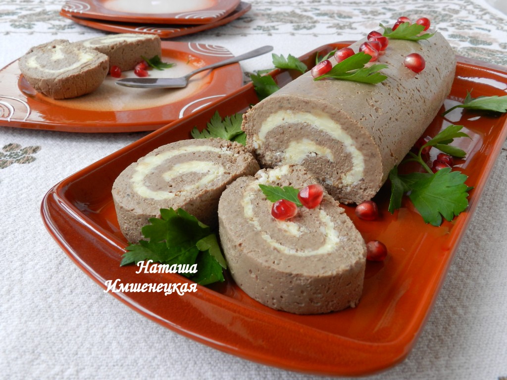 Вкусный, мягкий рулет из куриной печени с нежной начинкой из яиц и сыра нарезать на части и подать к повседневному или праздничному столу.