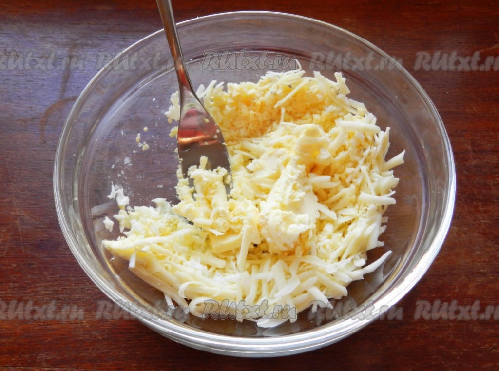 Для приготовления начинки нужно заранее достать сливочное масло из холодильника, чтобы оно размягчилось. Яйца нужно предварительно сварить вкрутую (в течение 10 минут после закипания воды), затем очистить и полностью остудить. В миску натереть на крупной тёрке сыр и варёные яйца, добавить мягкое сливочное масло, перемешать вилкой до получения однородной массы, посолить, поперчить по вкусу и начинка для рулета из куриной печени готова.